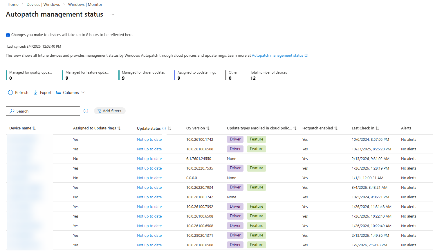 • [Windows] Autopatch update readiness offre une expérience unifiée pour le suivi et la résolution des problèmes liés aux mises à jour Windows sur les appareils inscrits à Intune et les appareils inscrits au groupe Windows Autopatch. À partir d'un tableau de bord unique, les administrateurs peuvent afficher tous les appareils gérés, y compris leur état d'inscription et les attributions de stratégies, afin de mieux comprendre l'état de préparation aux mises à jour dans leur environnement.