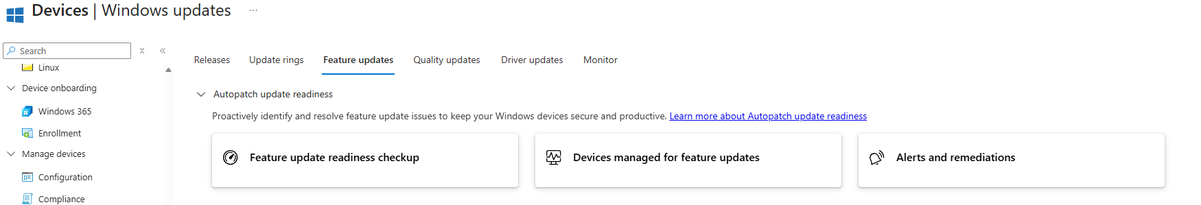 • Update readiness checker: évaluez de manière proactive les risques liés au déploiement des appareils et signalez ceux qui sont à risque en fonction de signaux tels que l'espace disque, les données d'évaluation et les conditions de configuration.