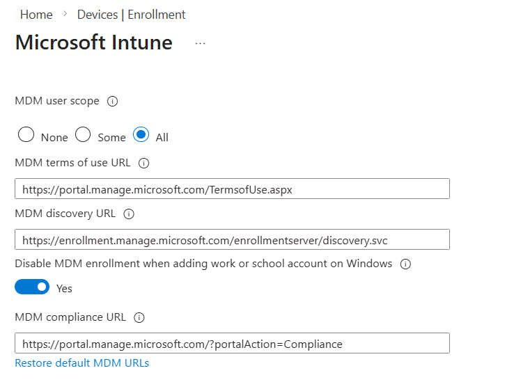 • [Windows] Public Preview d’un nouveau paramétrage qui affecte l’expérience d’enregistrement des comptes Microsoft Entra sur Windows. Le paramètre « Disable MDM enrollment when adding work or school account on Windows » détermine si les appareils doivent s’inscrire au MDM lors de la procédure d'enregistrement du compte. Le paramètre par défaut est défini sur « Non », ce qui autorise l'inscription MDM. Aucune action n'est requise, sauf si vous souhaitez modifier le comportement d'inscription par défaut.