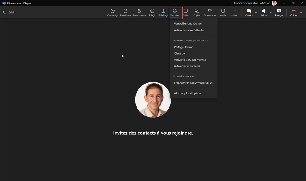 Ces contrôles consolident les fonctionnalités existantes dans un seul menu volant, Il est possible d’activer diverses fonctionnalités, comme l’accès à la salle d'attente, verrouiller une réunion, activer les caméras et d’autres options.