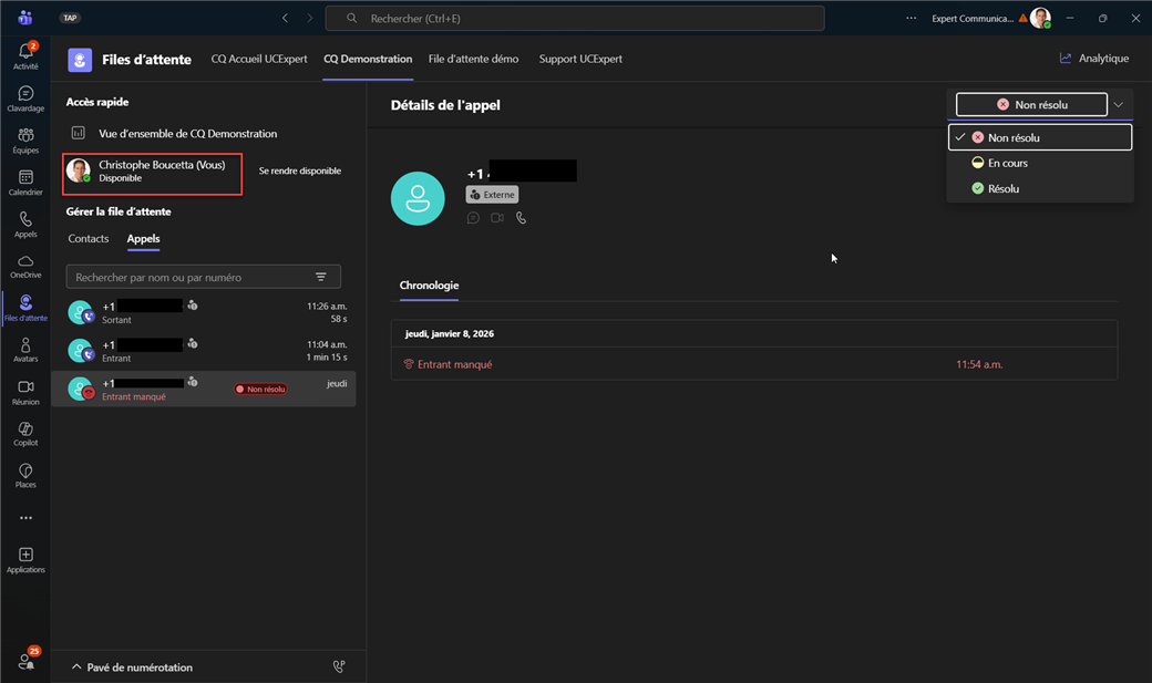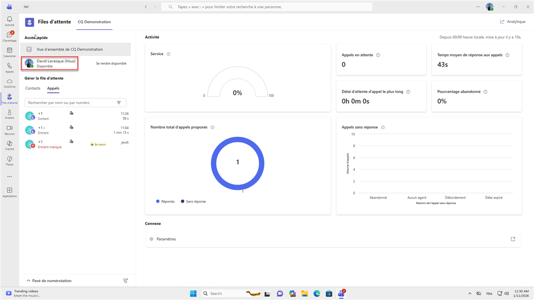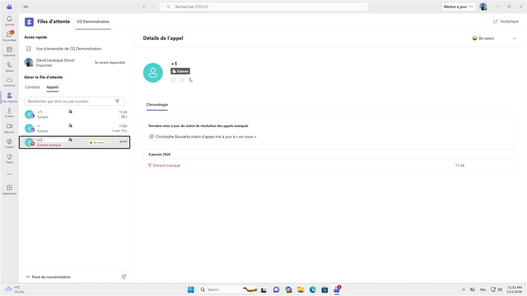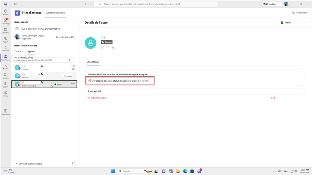 Les deux agents de la file d'appels CQ Démonstration Christophe et David partagent l'historique d'appels, les nouveaux appels sont visibles immédiatement.