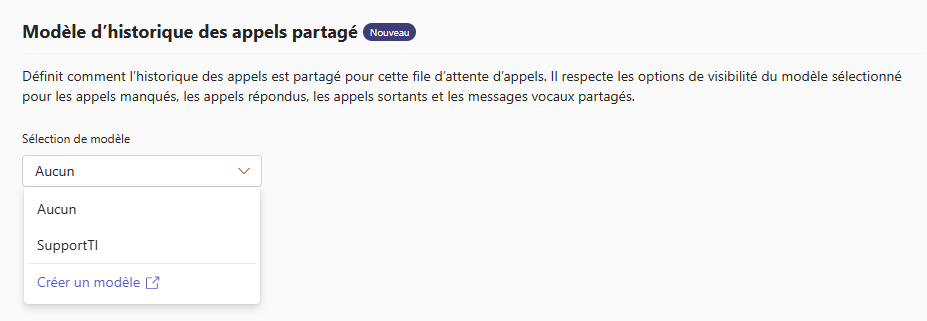 Une nouvelle section "Modèle d’historique des appels partagé" est désormais disponible dans l'onglet Information Générales de la configuration de votre file d'appels.