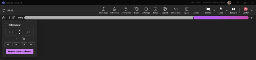 Un minuteur personnalisable est maintenant disponible en haut à gauche de votre fenetre de réunion MS Teams permettant au présentateur de définir le temps nécessaire.