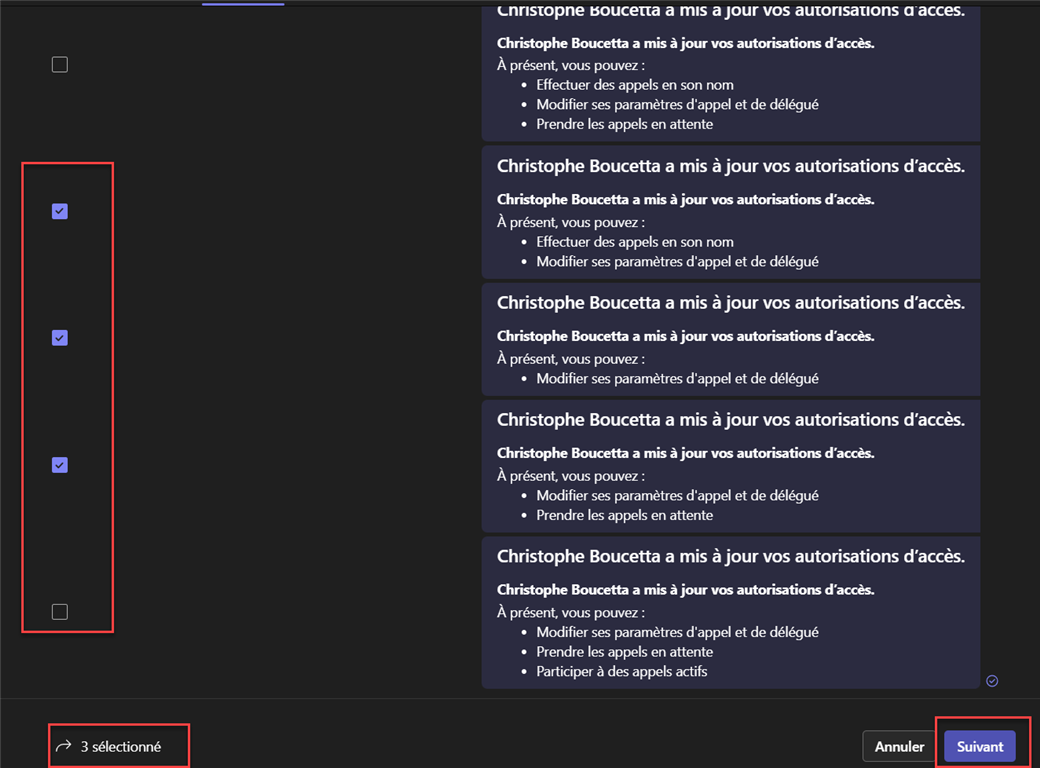 Les utilisateurs peuvent sélectionner peuvent sélectionner jusqu’à cinq messages et les transférer ensemble.