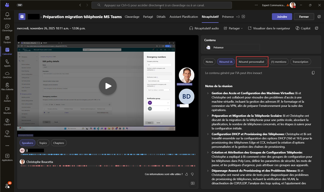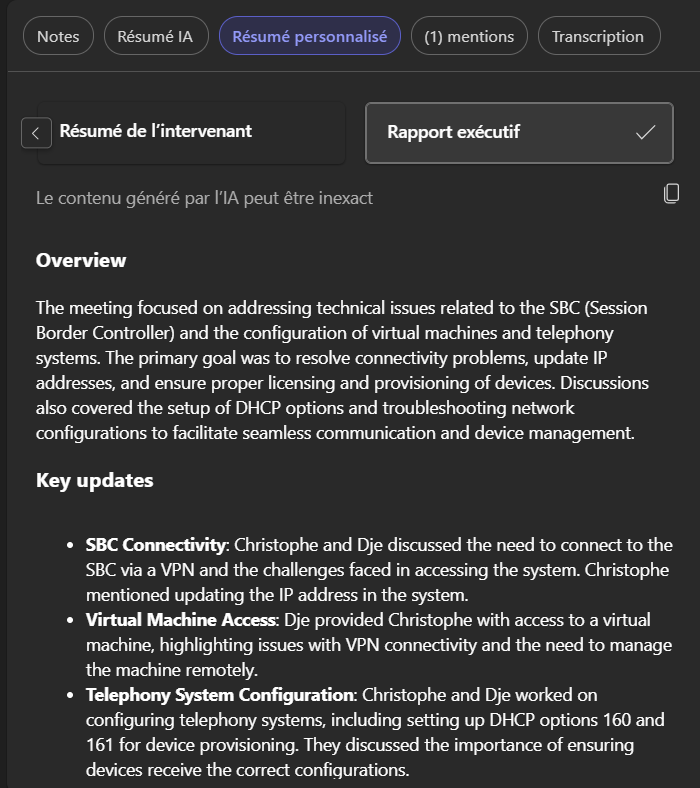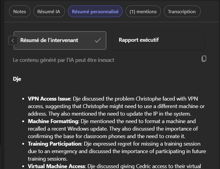 Cette fonctionnalité permet aux utilisateurs à gagner du temps en générant automatiquement des notes de réunion, des tâches recommandées et des points saillants personnalisés.