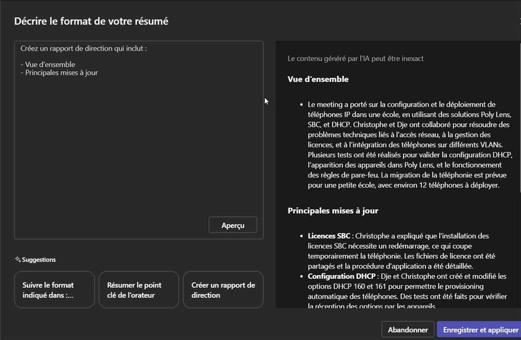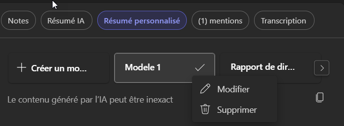 Pour les équipes qui préfèrent leur propre style, vous pouvez créer des modèles personnalisés à l’aide d’une simple invite en texte libre en décrivant la structure souhaitée, les notes générées par l’IA vont s'adapter instantanément.