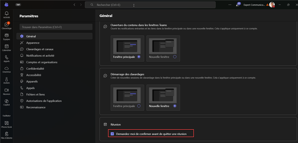 Un nouveau paramètre permet désormais d’activer une fenêtre de confirmation avant de quitter une réunion.