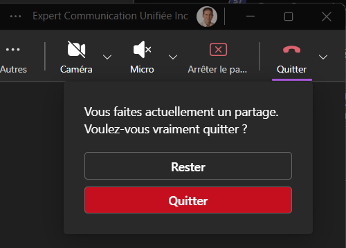 La situation est identique si vous sélectionnez l’option « Quitter » alors que vous partagez votre écran, une notification vous informe clairement que vous êtes en train de partager votre bureau.