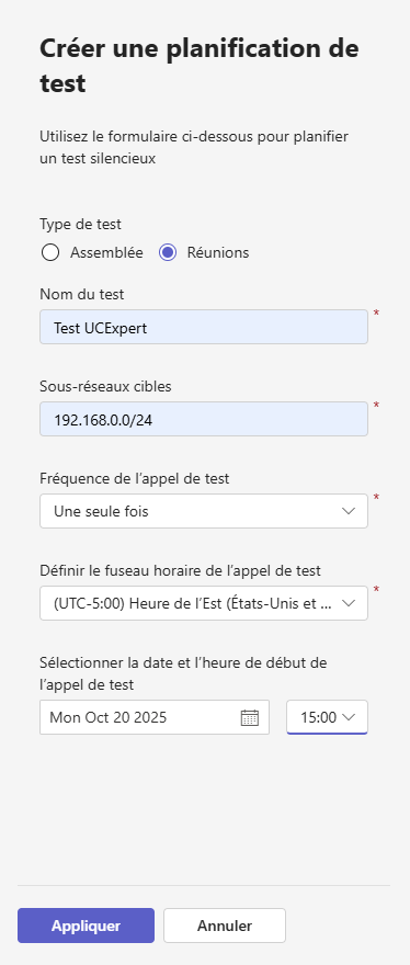 • Date et heure de début : date et heure auxquelles le test doit démarrer.