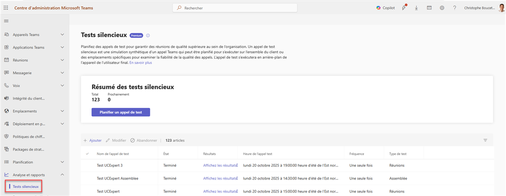 • Les tests s’exécutent en arrière-plan de manière silencieuse sur le client Teams aux horaires planifiés.