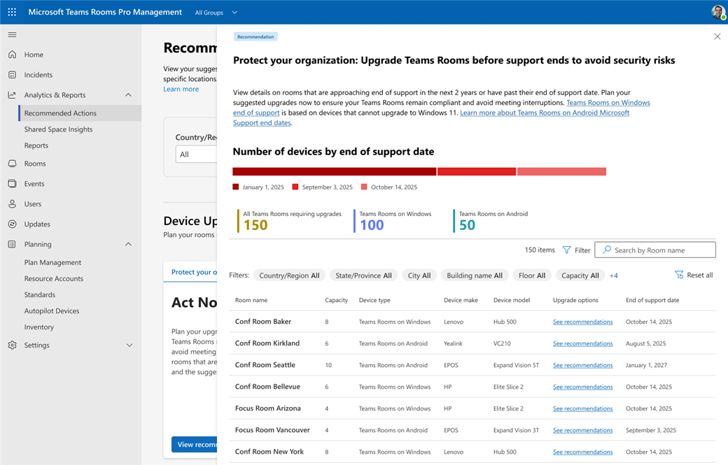 La fonctionnalité Actions recommandées offre également une plateforme pour des fonctionnalités à suivi rapide, comme la mise en avant des salles BYOD pouvant être mises à niveau vers MTR. Elle fournit aux administrateurs IT une méthode claire et basée sur les données pour prioriser les mises à niveau et prendre des mesures proactives en s’appuyant sur les informations propres au locataire.