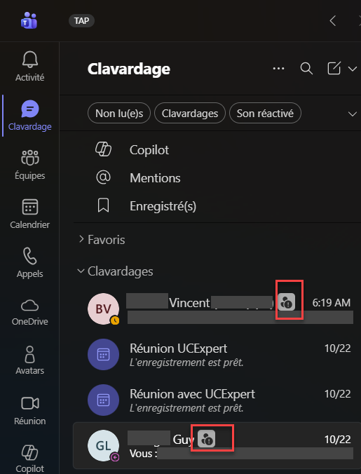 Dans votre liste de clavardage, cette icône apparaît également à côté du nom des participants.