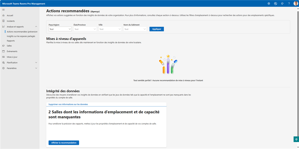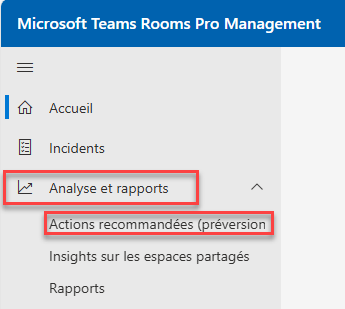 A partir du portail Teams Room Pro, Microsoft Teams Rooms Pro Management, naviguer dans Analyse et rapports, puis sélectionner Actions recommandées.