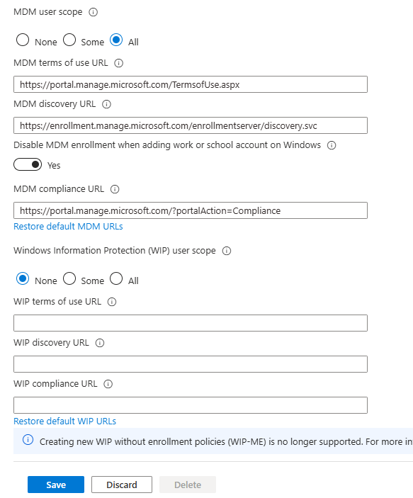 - Le paramétrage n'empêche pas l'utilisateur d'enregistrer son appareil dans la solution de MDM manuellement via l'application Settings/Paramétres de Windows. Ceci peut être géré via les stratégies de restriction d'enregistrement dans Microsoft Intune