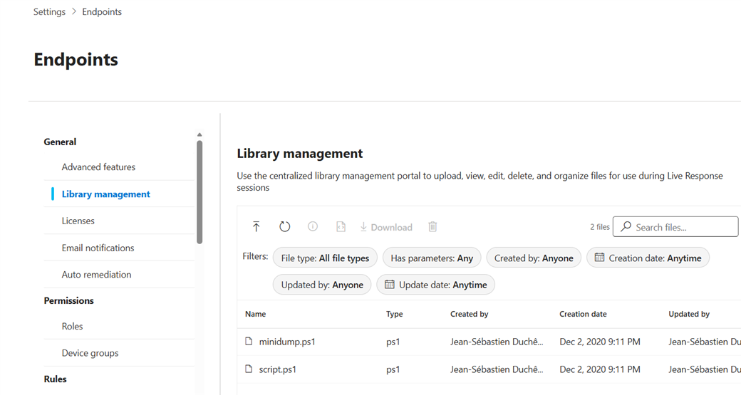 - Microsoft publie la gestion de la librairie de scripts utilisés pour le Live Response. Vous pouvez désormais afficher et gérer les fichiers et scripts utilisés pendant les sessions de réponse en direct dans le portail Microsoft Defender. Grâce à cette amélioration, vous bénéficiez d'une vue centralisée de tous les fichiers téléchargés et de leurs propriétés, et pouvez télécharger, afficher et supprimer des fichiers en dehors de la session de réponse en direct.