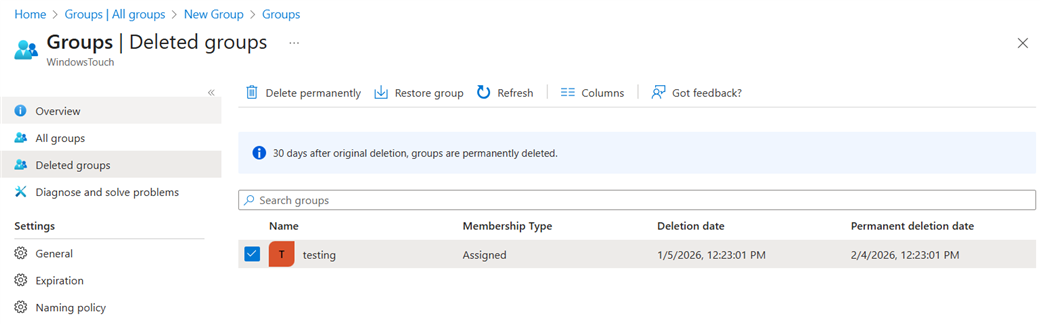 - Les administrateurs peuvent restaurer le groupe via le centre d’administration Entra ou l’API Microsoft Graph. Cette fonctionnalité réduit les pertes accidentelles et facilite la continuité d’activité.