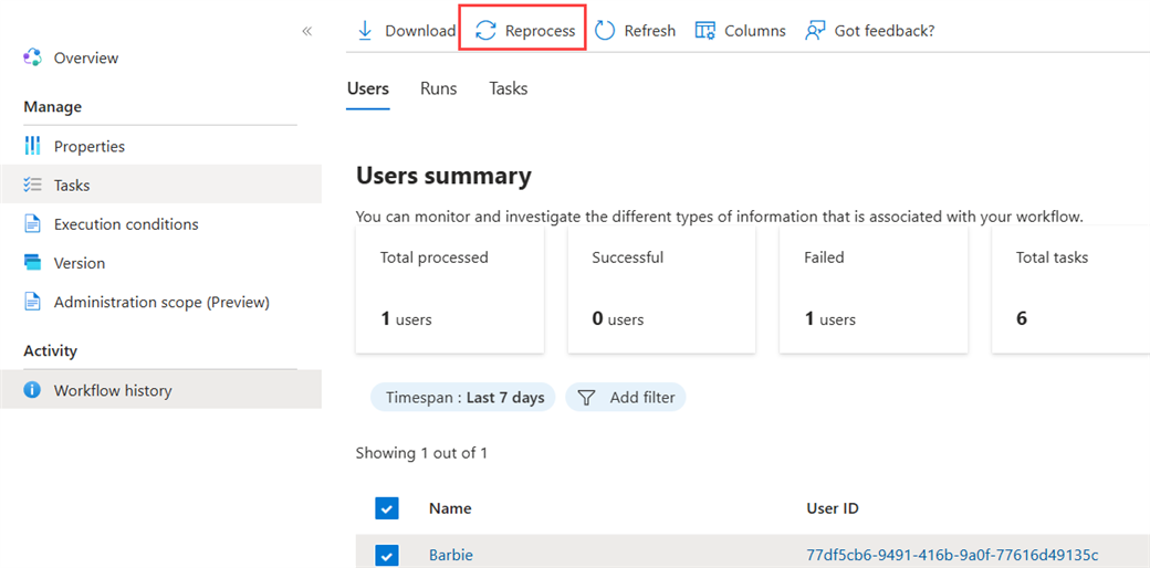 - Disponibilité générale du reprocessing des workflows et utilisateurs en échec. Les administrateurs peuvent relancer l’exécution d’un workflow, en choisissant :